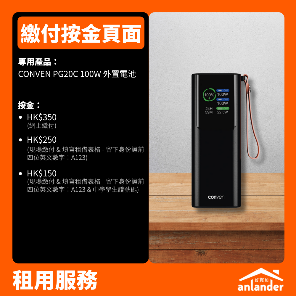此產品頁僅供「CONVEN PG20C 100W 外置電池」繳付租用按金之用。使用此頁面繳付租用按金即代表你同意相關產品的租借條款。