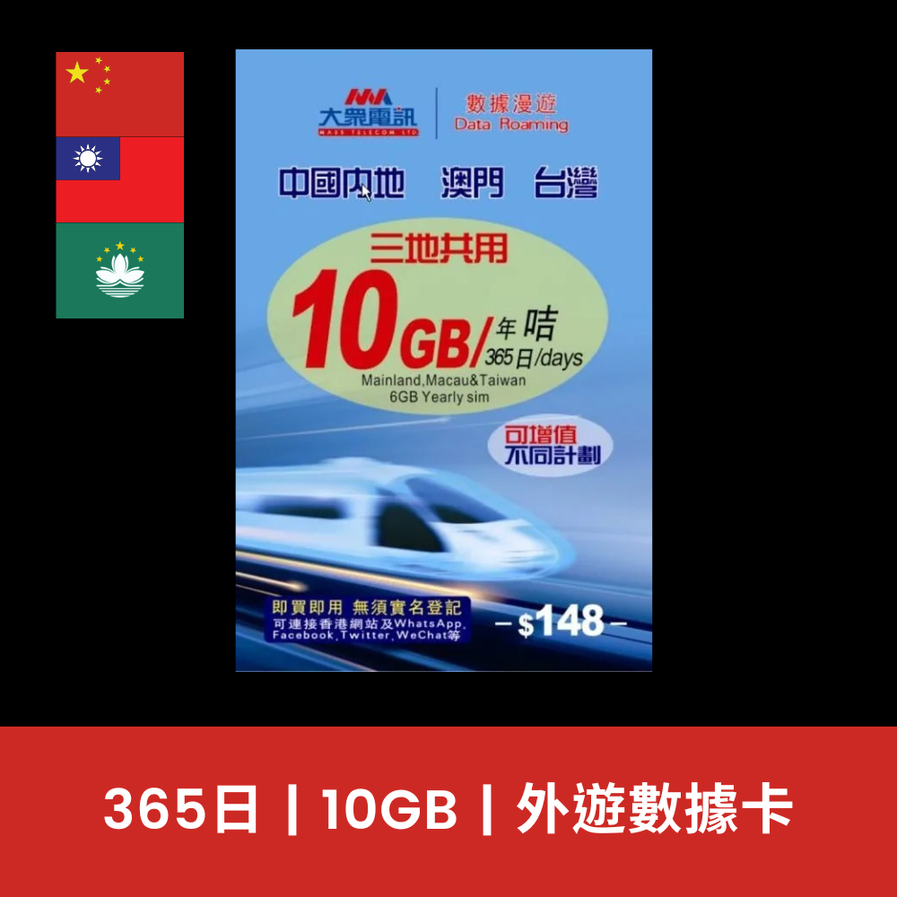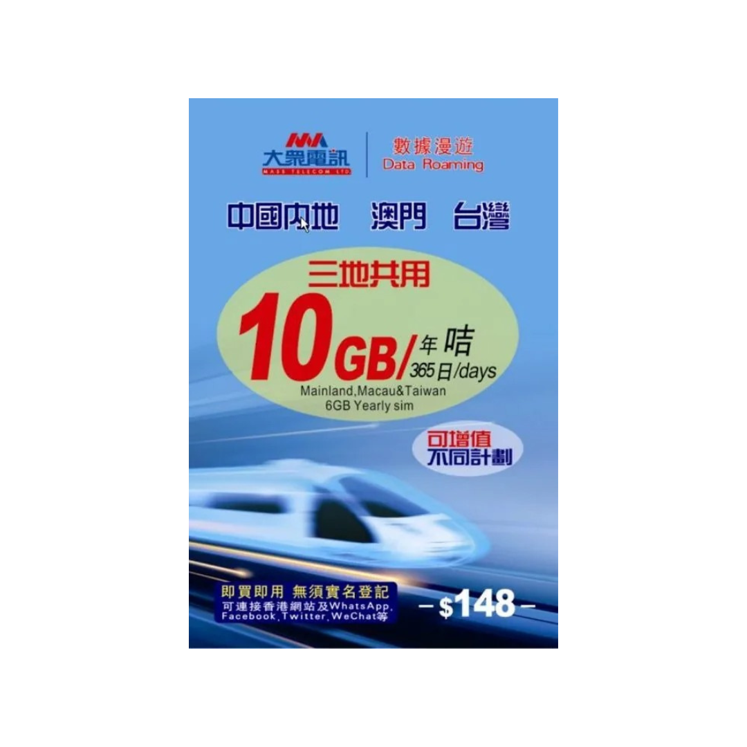 大眾電訊 中國、澳門、台灣 三地共用 10GB 數據電話卡(年卡)